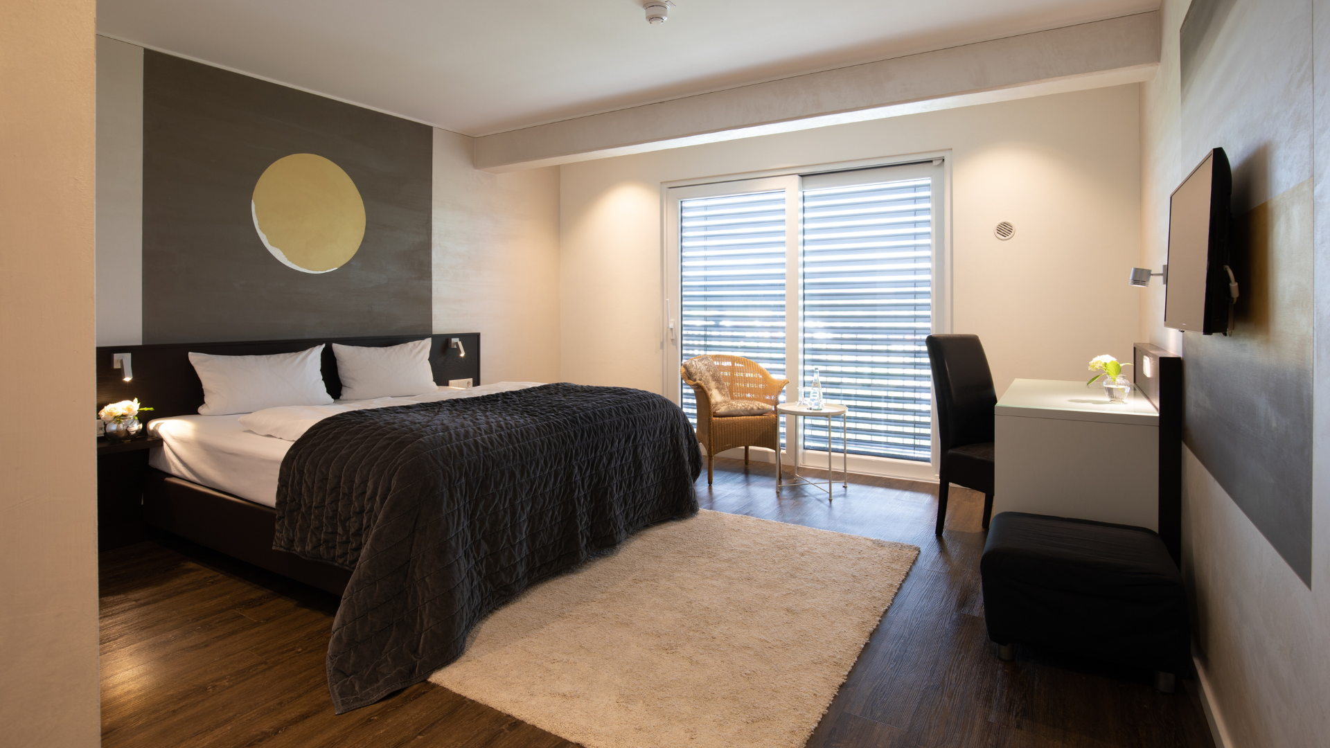 Unser größtes Zimmer. Bodentiefe Fenster. Balkon oder französischer Balkon. Ein wunderbarer Blick über das Wittlicher Tal. Boxspringbett. Klimatisiert. Kurz: Ein Ort zum Wohlfühlen. Gern zu zweit.